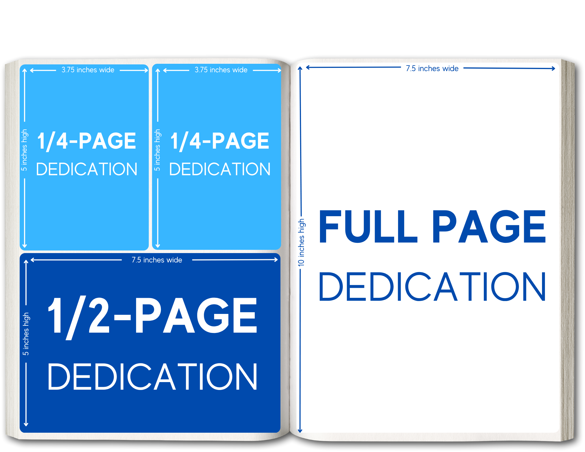 Need help designing your dedication? Purchase a dedication with our $20 Design-It-For-Me (DIFM) service. You’ll choose a premium template (bit.ly/SCYB-DIFM-Layouts), send us your photos and text, and we'll handle the design work. This service includes two rounds of proofs to ensure it's perfect.